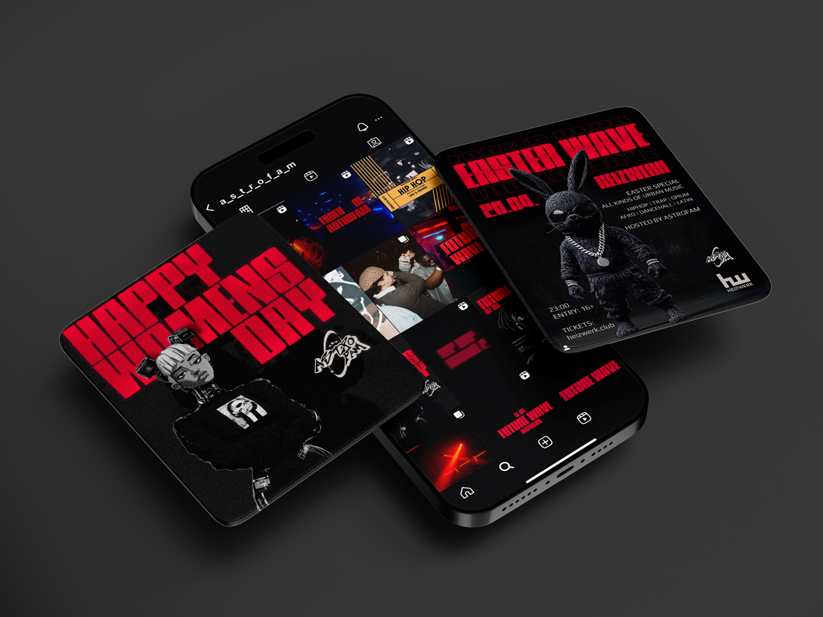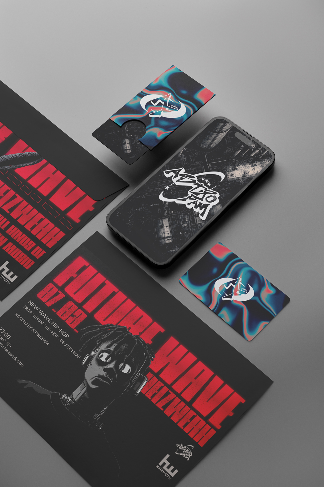I developed a bold visual language for the brand – combining glitch elements, custom typography and a moody color system to reflect AstroFad’s hybrid vibe between nightlife, fashion and experimental sound.