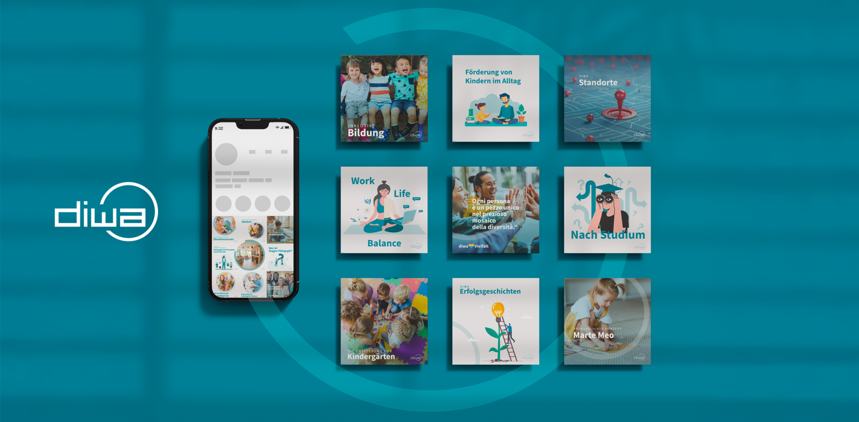 As part of the social media strategy for diwa GmbH, I was responsible for designing visual assets, developing a consistent Instagram grid and supporting the creation of content templates for Instagram, Facebook and TikTok. The focus was on translating strategic goals into a recognizable visual identity across all platforms.